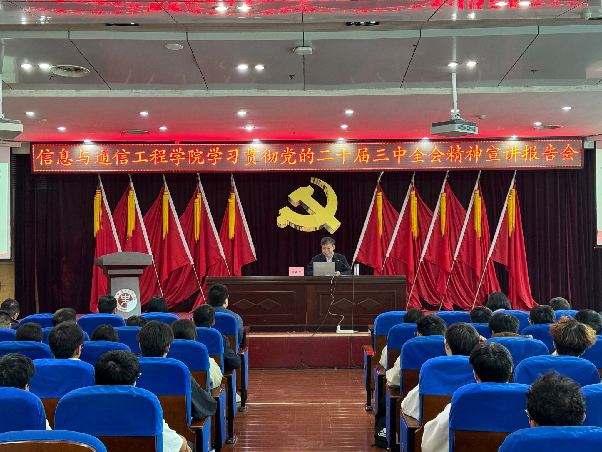 为深入学习贯彻党的二十届三中全会精神,全面、准确、完整领会全会意义、把握全会内容、增强贯彻自觉,10月31日上午,ok138cn太阳集团古天乐在图书馆报告厅举办学习贯彻党的二十届三中全会精神宣讲报告会。校党委副书记、工会主席宋晓炜,以《把握职责使命 主动挺膺担当--学习贯彻党的二十届三中全会精神投身学校改革发展》为题,为我院全体教师、学生代表200余人进行宣讲。会议由党总支书记邹海林主持。