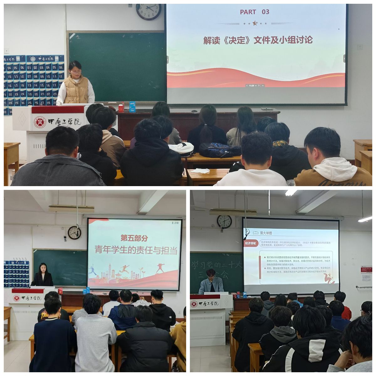 前期,学生干部认真准备,详细解读了党的二十届三中全会的重要意义、主要内容以及深远影响。各班级分别开展小组讨论,立足学生实际,就新时代的大学生如何积极响应党的号召,为实现中国式现代化贡献自己的力量进行交流。