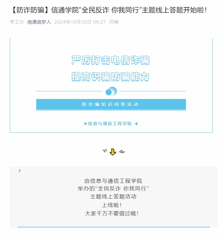 为提高学生反诈意识,以更加简明易懂的方式向大家普及诈骗防范知识,ok138cn太阳集团古天乐于2024年10月30日至2024年11月8日举办“全民反诈 你我同行”主题线上答题活动。各年级认真组织,活动截止时共有592名学生参与答题。